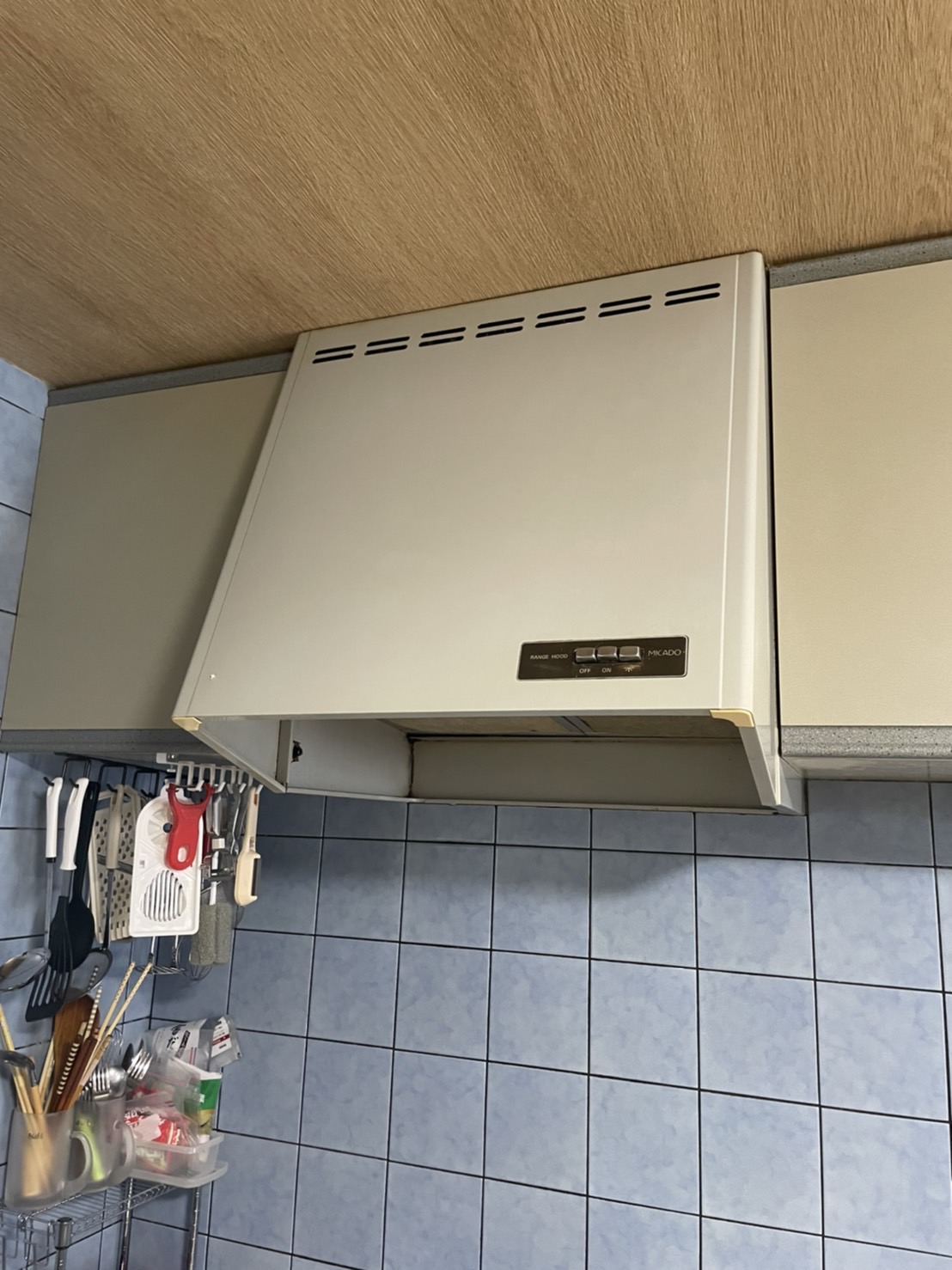 既存レンジフードを撤去後、新しい薄型レンジフードを設置。