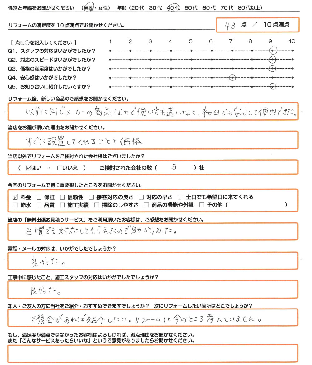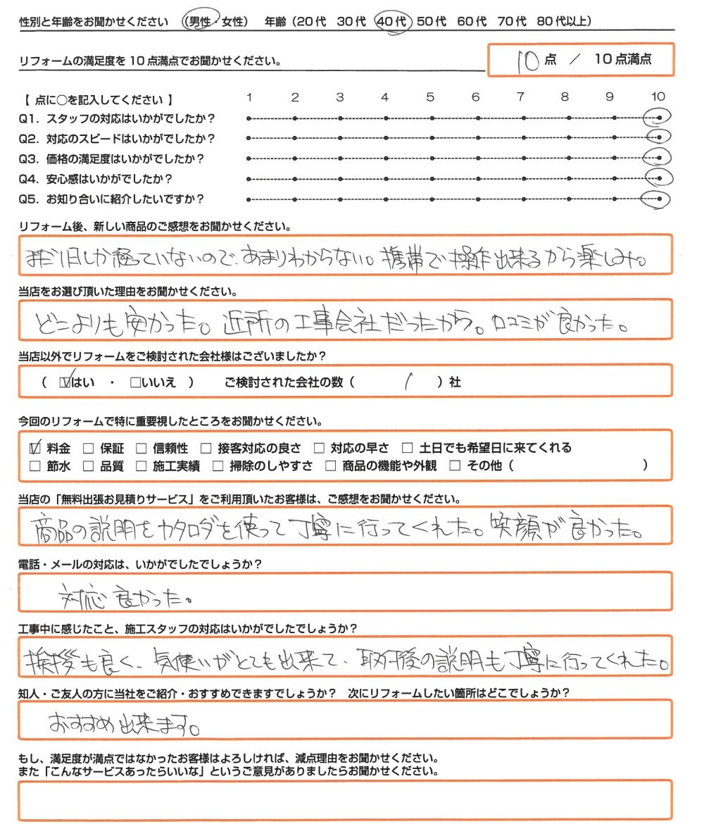 チラシを見て安いと感じていた。買い替えを決めた時にホームページを見ると更に安くなっていて電話をする事とした。電話をした次の日に来てくれて話をしたら信頼できると思い購入を決めた。自社施工にこだわる点も気に入った。