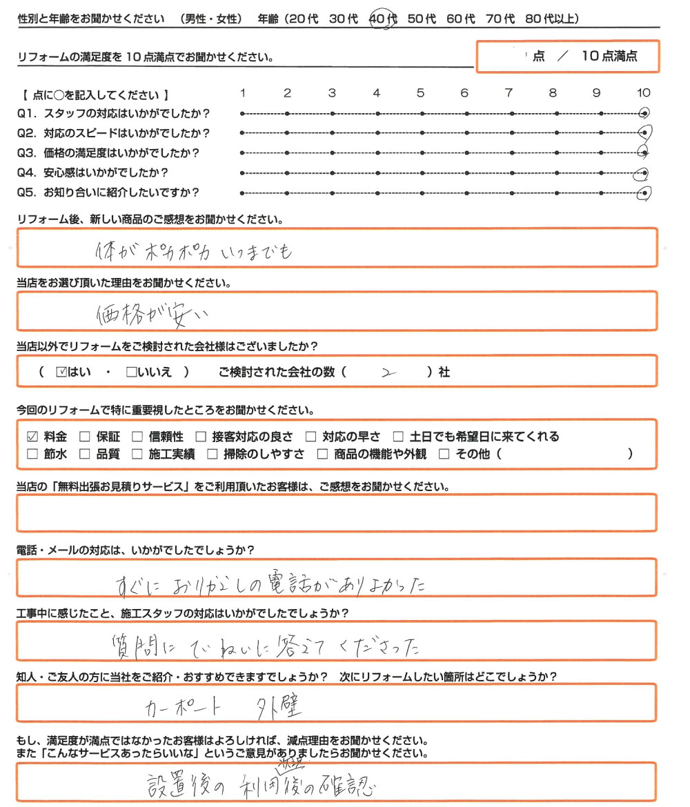 高槻市 エコキュート取替のお客様のご感想 2026年1月16日 最終更新日時 : 2026年1月16日 2026年01月16日【アンケートの内容】Q. リフォーム後、新しい商品のご感想をお聞かせください。 体がポカポカいつまでの Q. 当店を選ばれた理由をお聞かせください。 価格が安い Q. 当店以外でリフォームを検討された会社様はございましたか? はい 【ご検討された会社の数】 2社 Q. 今回のリフォームで特に重要視したところをお聞かせください 料金 Q. 当店の「無料出張お見積りサービス」をご利用頂いたお客様は、ご感想をお聞かせください - Q. 電話・メールの対応は、いかがでしたでしょうか? すぐにおりかえしの電話がありよかった Q. 工事中に感じたこと、施工スタッフの対応はいかがでしたでしょうか? 質問にていねいに答えてくださった Q. 知人・ご友人の方に当社をご紹介・おすすめできますでしょうか?次にリフォームしたい箇所はどこでしょうか? カーポート 外壁 Q. もし、満足度が満点ではなかったお客様はよろしければ、減点理由をお聞かせください。また「こんなサービスあったらいいな」というご意見がありましたらお聞かせください。 設置後の利用状況後の確認